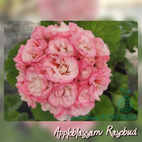 Зональная пеларгония, относится к "Розебадам". Большое количество цветков в соцветии, каждый цветок - розочка с зеленоватым центром, белыми лепестками и розовым краем лепестков, напоминает окраской яблоневый цвет. Цветет очень эффектно. Нуждается в подкормках. Отлично проявляет себя, если вынести летом в сад. |