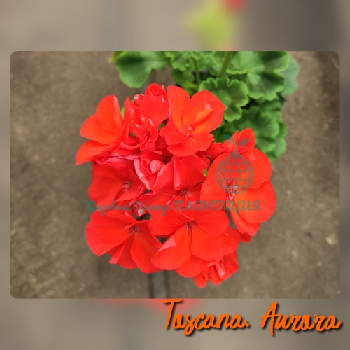 05572 Пеларгония зональная (Lat.: Pelargonium zonale) `TOSCANA. AURORA`" Вид поставки: штука Цена: 320-00 ОПИСАНИЕ: Полумахровый сорт. Цветок полумахровый, яркий, оранжевый. Соцветия плотные округлые, на высоких цветоносах. Лист зеленый с сильно выраженной зоной. Цветение обильное. Куст довольно крупный, но хорошо формируется, пушистый. ПОСАДКА И УХОД: Написать в отдел продаж