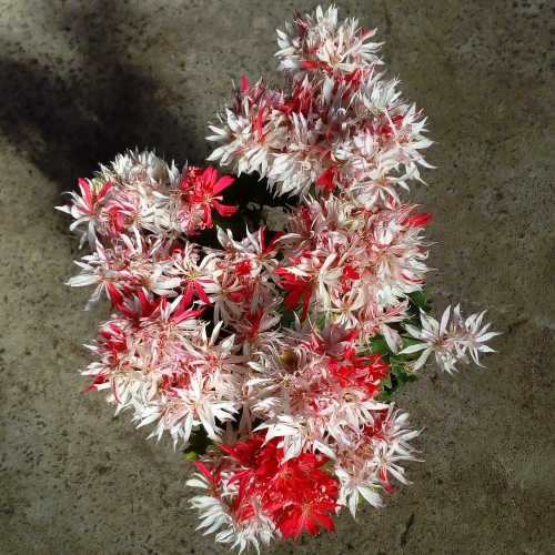 При хорошем освещении цветение очень обильное. Цветки крупные с длинными узкими лепестками. Цвет лепестков варьирует от светло-розового до сгущающегося к концу цветения, крапчатость вариабельна. При хорошем освещении соцветия крупные , особенно на фоне миниатюрного куста, плотные. Неприхотливый сорт. |