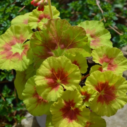 Невероятное сочетание Светло-салатовой, почти желтой листвы с оранжево-коричневой зоной и ярких оранжево-красных цветков! Сорт компактный, необычайн яркий, солнечный! Цветносы крепкие, поднимают соцветия над листвой. Сорт коллекционный, яркий, эффектный. |